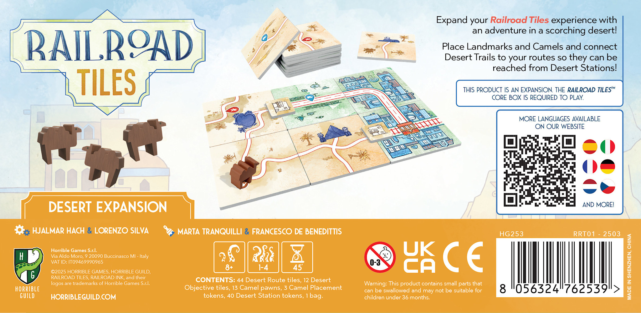 An expansion pack for Railroad Tiles, a sequel to the roll-and-write series Railroad Ink, is a quick-playing tile placement game in which you pick tiles and place routes to build an interconnected community. Add deserts to your transportation network and populate them with camels!