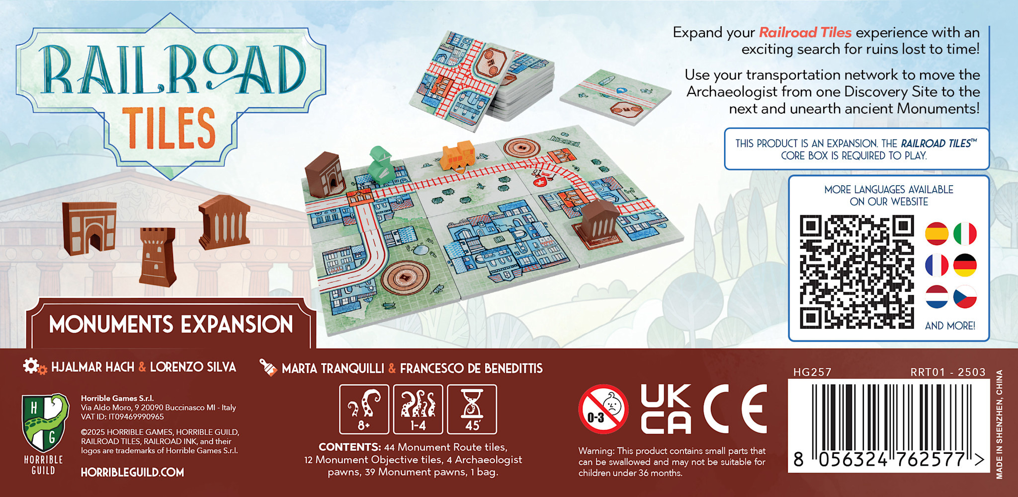 An expansion pack for Railroad Tiles, a sequel to the roll-and-write series Railroad Ink, is a quick-playing tile placement game in which you pick tiles and place routes to build an interconnected community. Add excavation sites to your transportation network and populate them with monuments!
