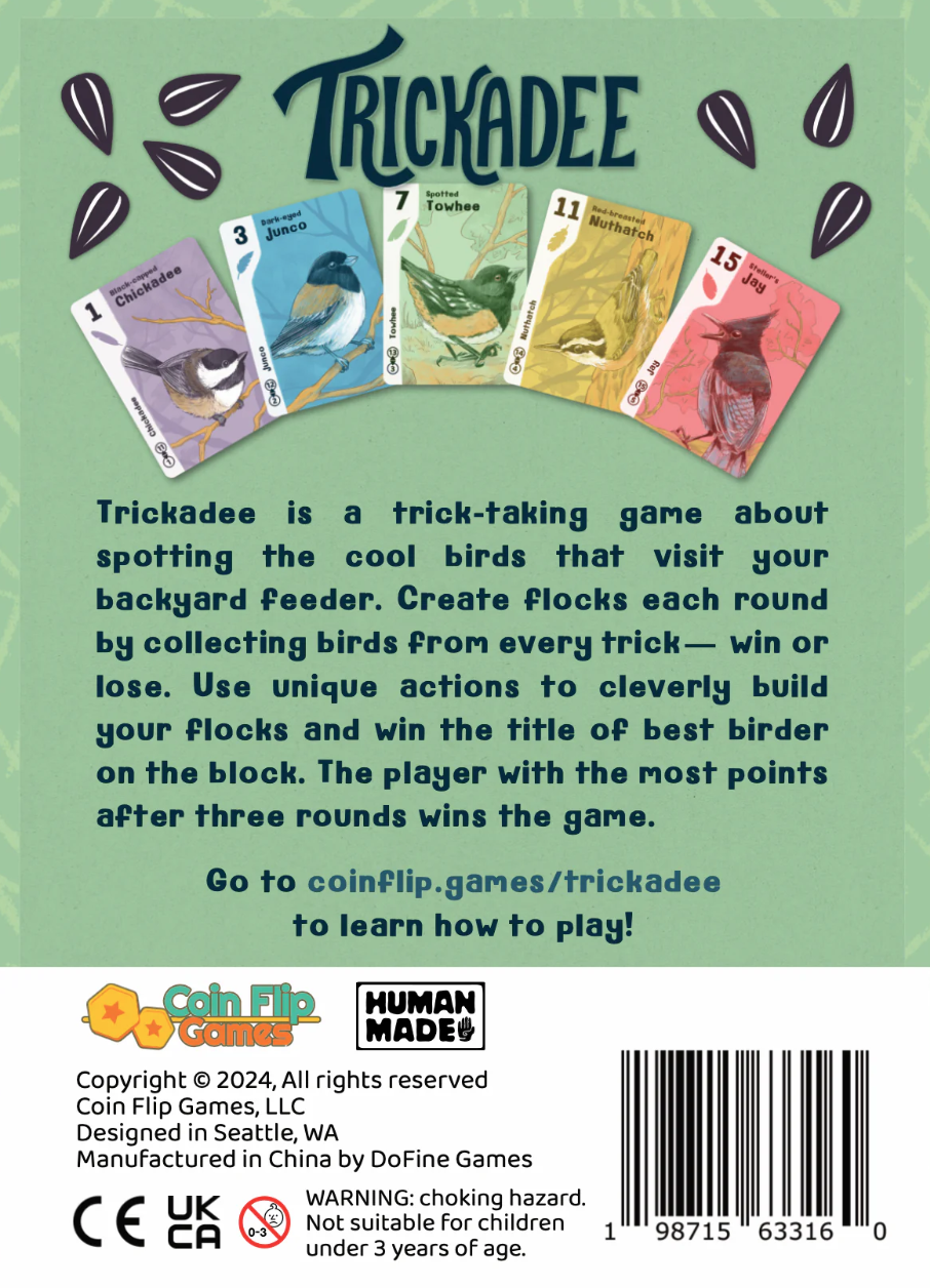 Trickadee is a clever trick-taking game where sometimes you win by coming in last. Play birds to the feeder and collect them into flocks. Cleverly play the right birds to come in first, third, or last place to gain abilities that allow you to make better flocks.