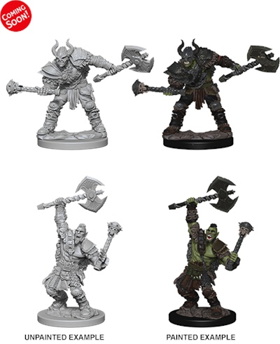 Miniatures come unpainted and pre-primed. Contains two Half Orc Barbarian models.